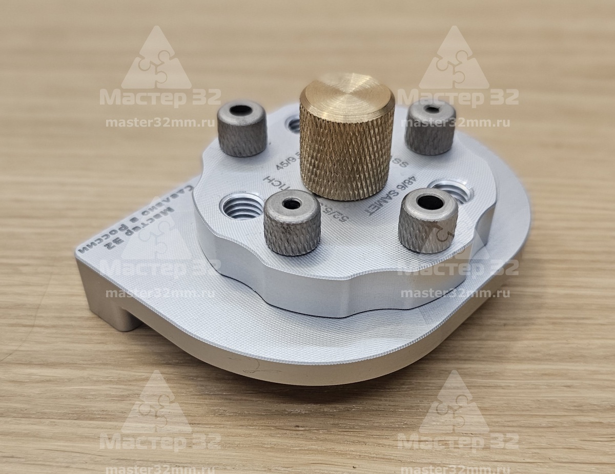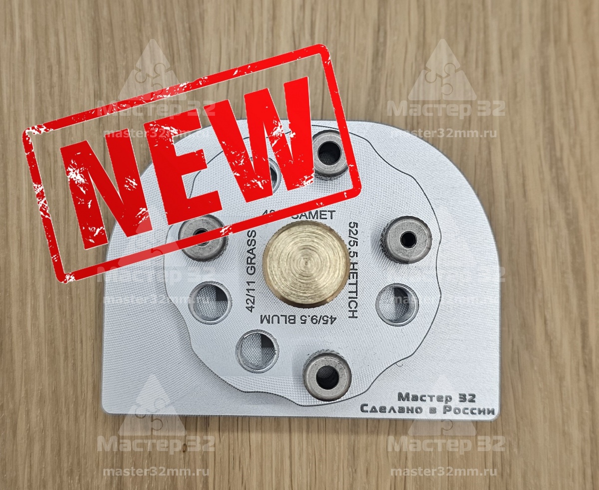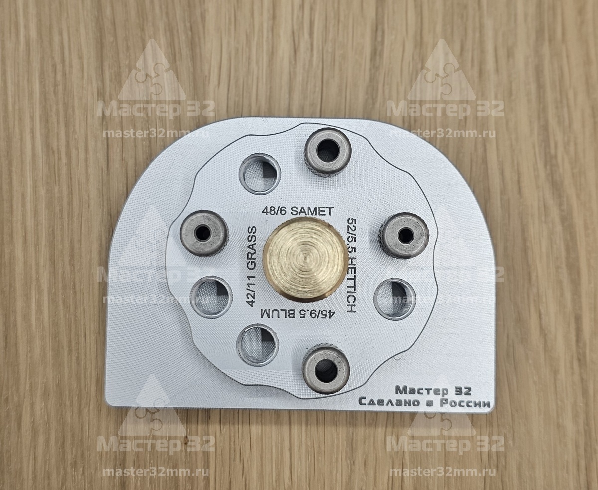 Кондуктор позволяет сверлить под петли с присадочными картами 52/5.5, 45/9.5, 48/6, 42/11 (HETTICH, BLUM, SAMET, GRASS и многие другие)